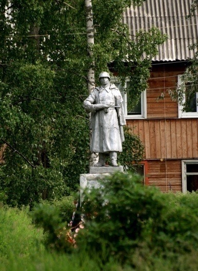 Гуляя днем по Медвежьегорску, я внезапно сквозь листву увидел белую скульптуру. Я решил, что это Ленин. Но подойдя ближе, я увидел, что это воин времён второй мировой войны. Это памятник он стоит в маленьком сквере и утопает в зелени. Рядом лежат венки. Видно, что за всем этим ухаживают.